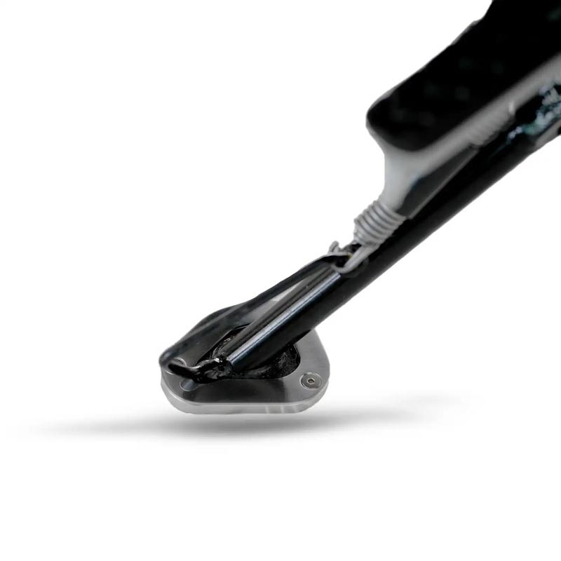 R&G Racing Seitenständerauflagen werden auf Ihren Originalständer geschraubt und verdoppeln die Auflagefläche, sodass dieser nicht einsinkt. Trotz der größeren Größe werden Bodenfreiheit und Kettenlinie unter normalen Fahrbedingungen nicht beeinträchtigt.