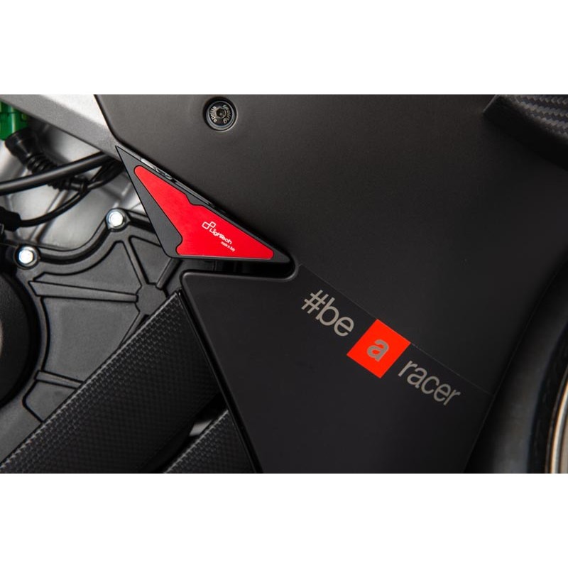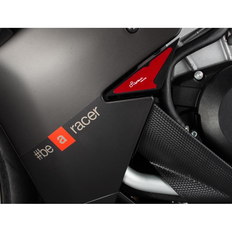 Die LighTech Rahmenschützer wurden entwickelt, um die Verkleidung, den Motor und andere Motorradteile vor Stößen und Beschädigungen zu schützen. Jede einzelne Komponente wurde sorgfältig geprüft und optimiert, um maximalen Schutz zu gewährleisten. Die LighTech Rahmenschützer werden mit allem benötigten Montagematerial (inkl. Stiften und Distanzstücken) geliefert. Das Produkt besteht aus einer aus Massivholz CNC-gefrästen Aluminiumhalterung und einem aus speziellem Nylonpolymer gefertigten Schieber. Das Design dieses LighTech Rahmenschützer-Modells ist speziell auf die Form des Motorrads abgestimmt (es hat im Vergleich zu anderen Rahmenschützern eine spitz zulaufende Form). Ein roter Einsatz aus Ergal 7075 mit dem lasergeprägten LighTech-Logo verleiht dem Produkt eine elegante Optik. Eine Besonderheit des Produkts ist, dass es eine Sollbruchstelle in der Befestigungsklammer (in diesem Fall mittig) besitzt, die den Motorradrahmen im Falle eines Sturzes zusätzlich schützt.