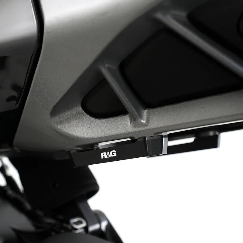 Wenn Sie die Soziusfußrasten entfernt haben, füllen Sie die zurückbleibende Lücke und bedecken Sie die ansonsten freigelegten Löcher im Rahmen mit den R & G-Abdeckplatten.