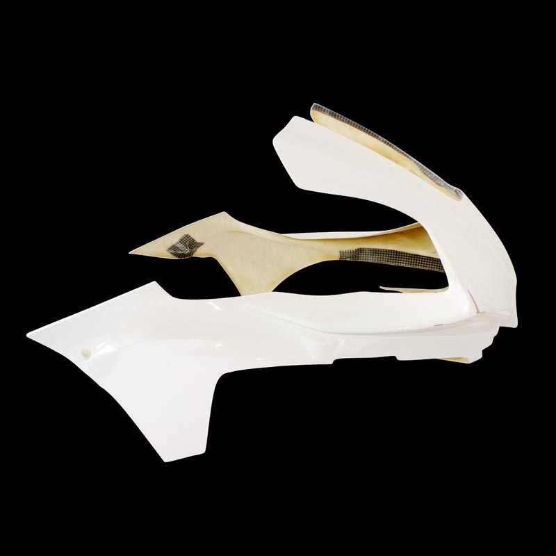 Die Verkleidung ist lackierfertig und hat eine weiße Gelcoat-Oberfläche. Die Montage ist einfach, da die Sebimoto-Verkleidungen die originalen Befestigungspunkte nutzen. Diese Befestigungspunkte sind für verbesserte Stabilität mit Carbon-Kevlar verstärkt. Sebimoto fertigt leichte Verkleidungen bei gleichzeitig hoher Festigkeit. Die flexible Konstruktion minimiert das Bruchrisiko bei Stürzen. Material: 4 Lagen Fiberglas, Gewebeoberfläche + weiße Gelcoat-Beschichtung.