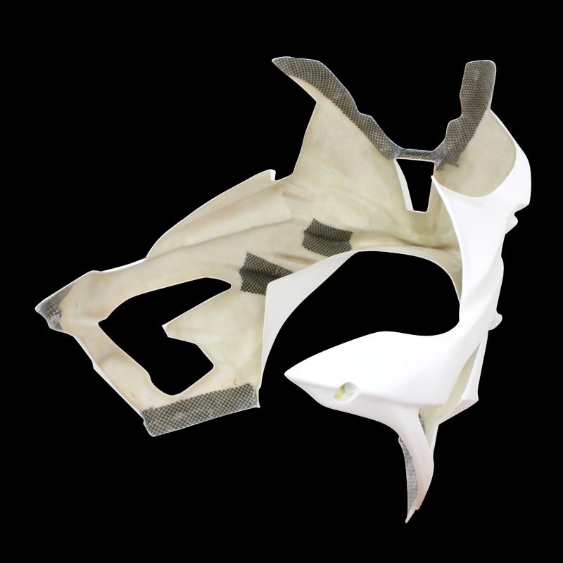 Verkleidungsteil lackierfertig, weiße Gelcoat-Oberfläche. Einfache Montage dank Verwendung der originalen Befestigungspunkte. Carbon-Kevlar-Verstärkung an den Befestigungspunkten und breite Bänder an den Verbindungsstellen sorgen für verbesserte Stabilität. Sebimoto fertigt leichte Verkleidungen bei gleichzeitig hoher Festigkeit. Die flexible Verkleidung reduziert das Bruchrisiko bei Stürzen. Materialzusammensetzung: 4 Lagen Fiberglas, Gewebebeschichtung + weiße Gelcoat-Beschichtung. Der sorgfältige Fertigungsprozess von Sebimoto garantiert optimale Oberflächenqualität.