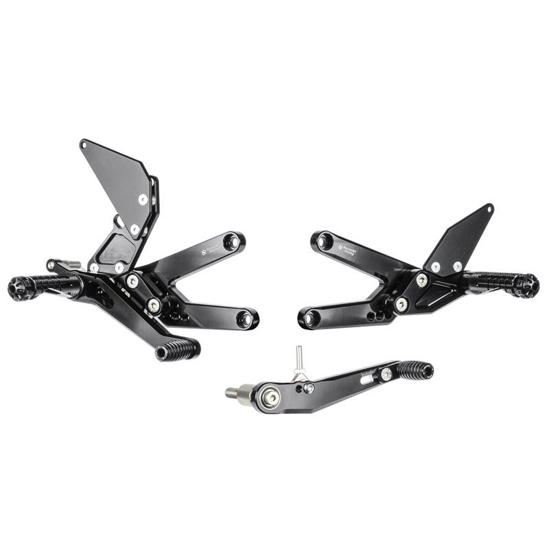 - Rearset made of high-strength aluminum alloy - Black anodized for increased durability - 9-position adjustment - Compatible with standard and reverse shift (GP shift) - 100% Made in Italy