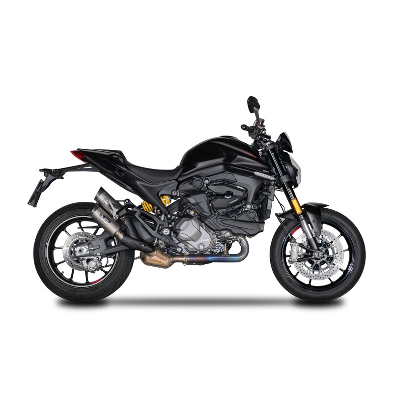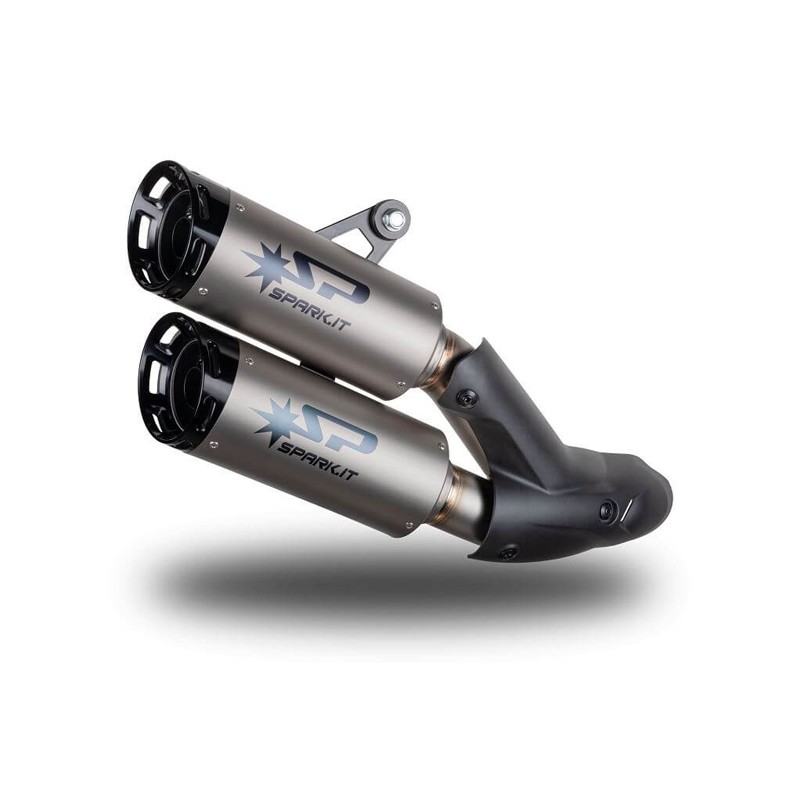 - Type : Homologated twin silencers - 2x Spark DYNO silencers - For right side mounting (one above the other) - Material : Titanium - Connecting pipe material : Titanium - Silencer end cap material : Carbon / black anodized Aluminium/ red anodized Aluminium for choice - Weight : Standard 3.0 kg / Spark 2.1 kg - made in Italy