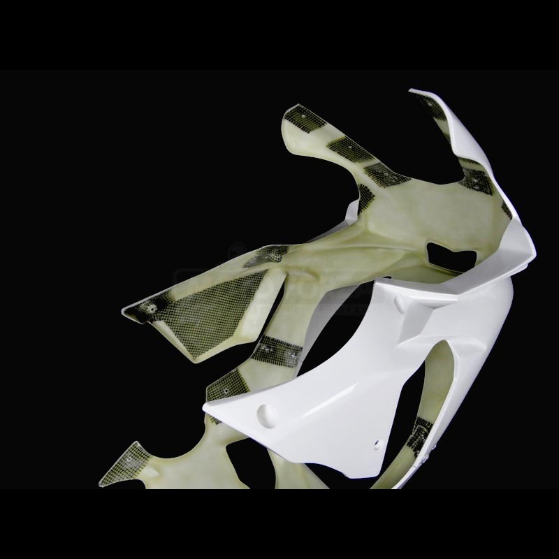 The woven roving and sprayed resin construction gives the fairings unparalleled flexibility, strength, thinness, and lightness. Large carbon/Kevlar reinforcements at the mounting points provide exceptional durability.