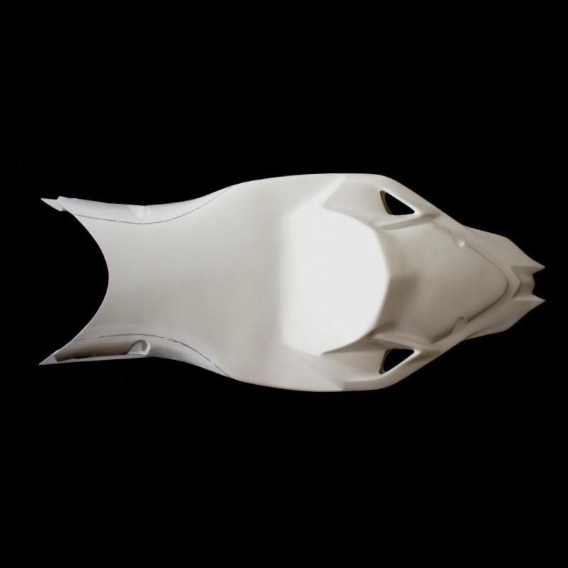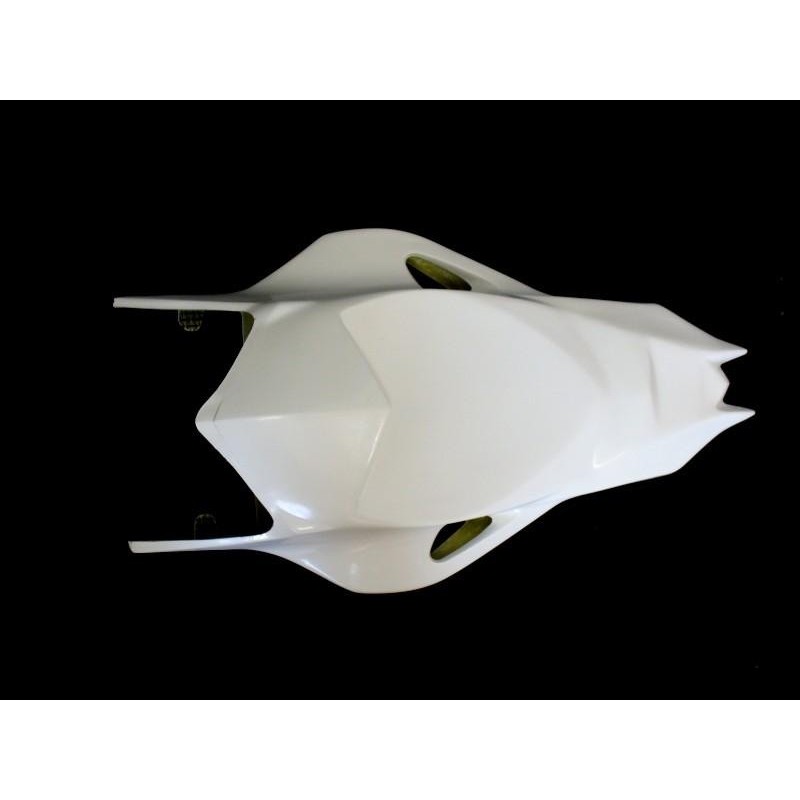 The top fairing, side fairings, and oil pan are not compatible with the original parts, but only with each other. Lightweight, flexible, and durable thanks to the combination of composite materials and precise handcrafting. Multiple layers of Kevlar-carbon reinforcements provide additional durability. The top fairing can be used with the original windscreen. Our racing lower fairings and racing oil pan hold 4 liters of oil according to regulations. Closed racing seat with foam padding:
