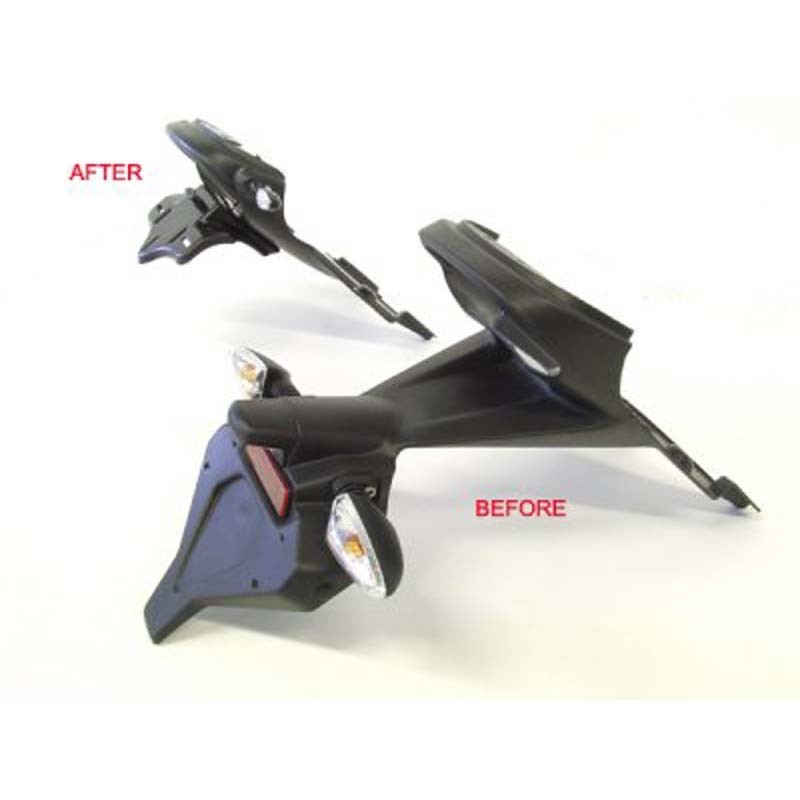 We are now offering the new, elaborately crafted R&G tail conversion/license plate holder. Made from 3mm thick, black powder-coated aluminum for a perfect look and quality. A small LED license plate light with an E-mark is included. The license plate holder can be used with both the original indicators and our R&G micro indicators.