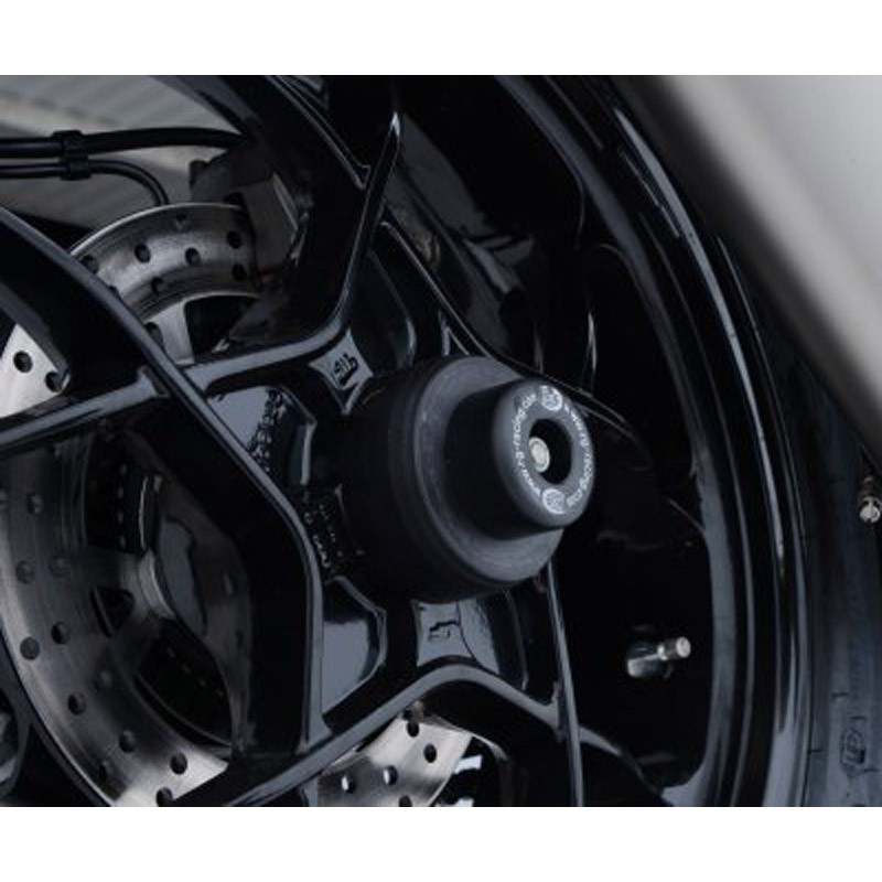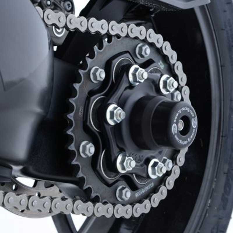 The swingarm protection pads feature a stainless steel axle that passes through the rear wheel axle. They are very easy to install and effectively protect your swingarm in the event of a fall, for example.