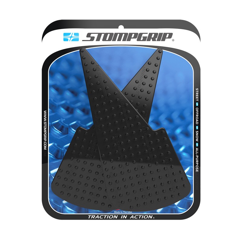 In 2002, STOMP Design expanded its product line to motorsports, launching STOMPGRIP tank grips, specifically designed for motocross. These abrasive grips are designed to keep the rider in the saddle by adhering to their pants or boots. They have since become applicable to road bikes, motocross bikes, and ATVs. Ultimately, they are essential accessories and allies against fatigue and rider wobble, regardless of your preferred motorcycle. The grips are specifically designed to fit the contours of each machine and are also rounded to prevent premature peeling. The rubber surface is available in either clear or black to complement the aesthetics of your motorcycle. These products are designed to wear out in the same way as tires, and need to be replaced periodically.