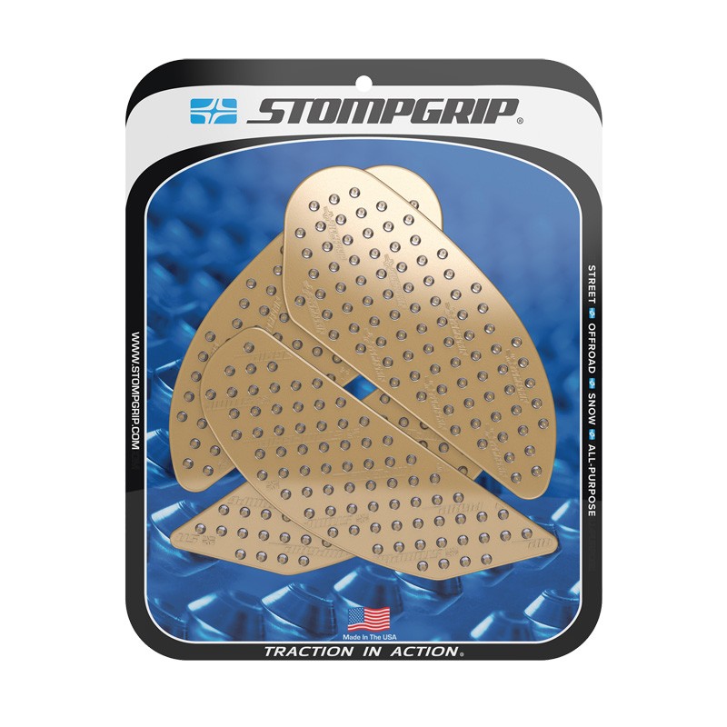 In 2002, STOMP Design expanded its product line to motorsports, launching STOMPGRIP tank grips, specifically designed for motocross. These abrasive grips are designed to keep the rider in the saddle by adhering to their pants or boots. They have since become applicable to road bikes, motocross bikes, and ATVs. Ultimately, they are essential accessories and allies against fatigue and rider wobble, regardless of your preferred motorcycle. The grips are specifically designed to fit the contours of each machine and are also rounded to prevent premature peeling. The rubber surface is available in either clear or black to complement the aesthetics of your motorcycle. These products are designed to wear out in the same way as tires, and need to be replaced periodically.