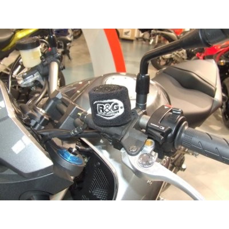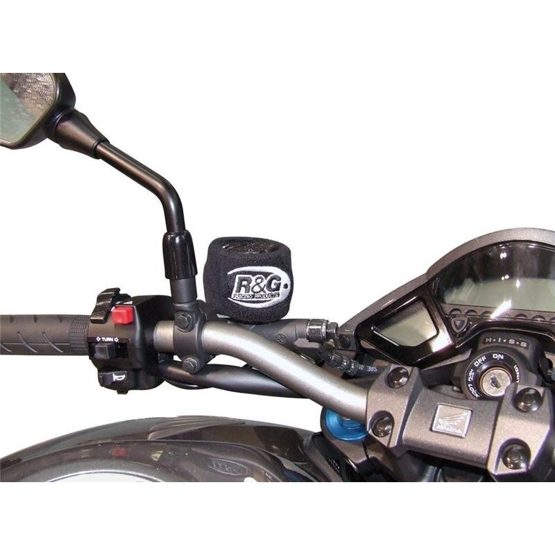 This black elastic protector features a white stitched R&G logo on two sides. It simply slips over your clutch or brake fluid reservoir and keeps it safe!