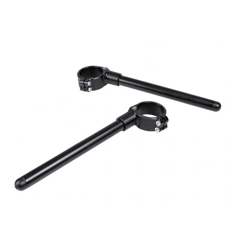 Les demi-guidons racing Bonamici sont en aluminium taillé masse. Disponibles en différents diamètres, il est également possible de les avoir en différentes couleurs sur demande, le noir restant cependant le standard. Les demi-guidons sont réhaussés de 15 mm avec un angle d’inclinaison de 6,5°. Les versions finissant par le code -B ne sont pas réhaussées et ont un angle également de 6,5°.