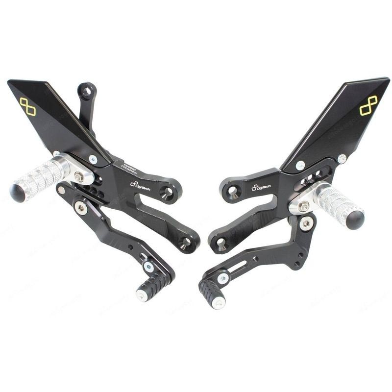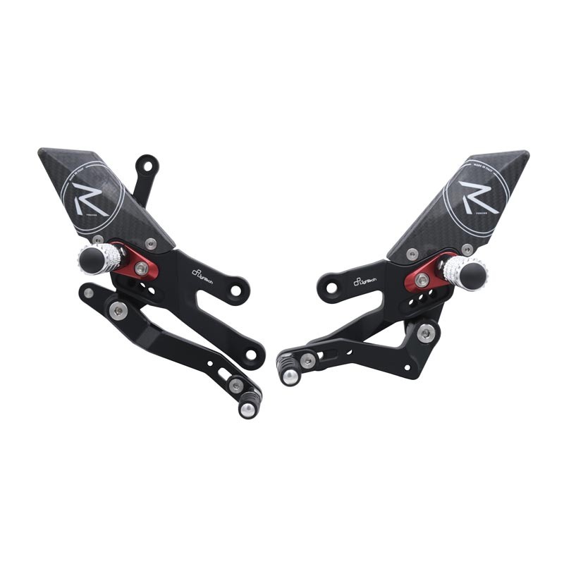 - Version "R" : Visserie complète en titane pour une solidité et un gain de poids, protèges-talons en carbone "Black&Red", reposes-pied pliables, embouts de sélecteurs articulés et supports de reposes-pieds rouges.