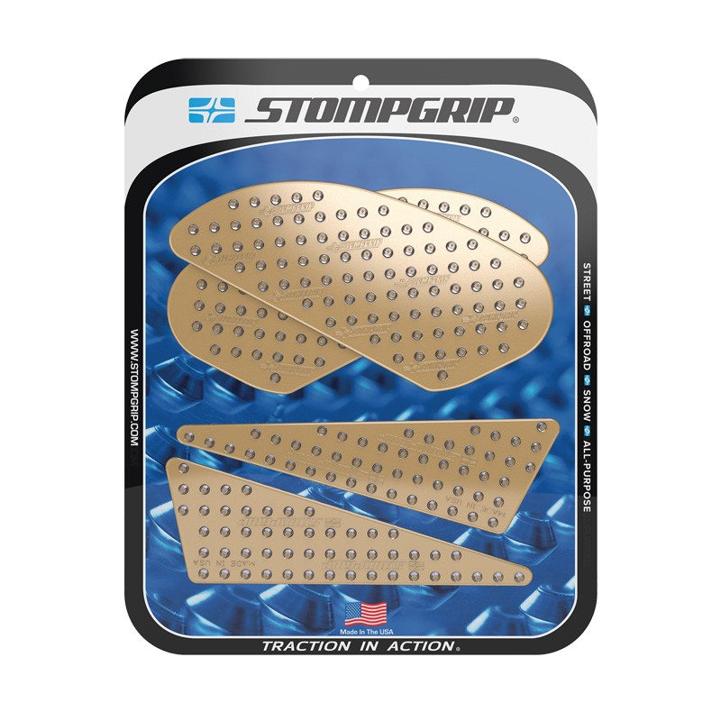 En 2002, STOMP Design élargit sa gamme jusqu'aux sports mécaniques, en lançant les grips de réservoir STOMPGRIP, spécialement conçus pour les moto-cross. Ces grips abrasifs ont pour vocation de garder le pilote en selle, en collant à son pantalon ou à ses bottes. Ils sont depuis lors applicables aux machines de route, de cross ou de quad. Ce sont finalement des accessoires indispensable, et des alliés contre la fatigue et le ballotage, quelle que soit votre machine de prédilection. Les grips sont spécialement conçus en fonction de la physionomie de chaque machine, ils sont également coupés à l'arrondis, afin d'éviter les décollements précoces. La surface en caoutchouc est soit transparente, soit noire, pour respecter l'esthétique de votre machine. Ces produits sont conçus pour s'user à la manière des pneus, et sont à remplacer périodiquement.