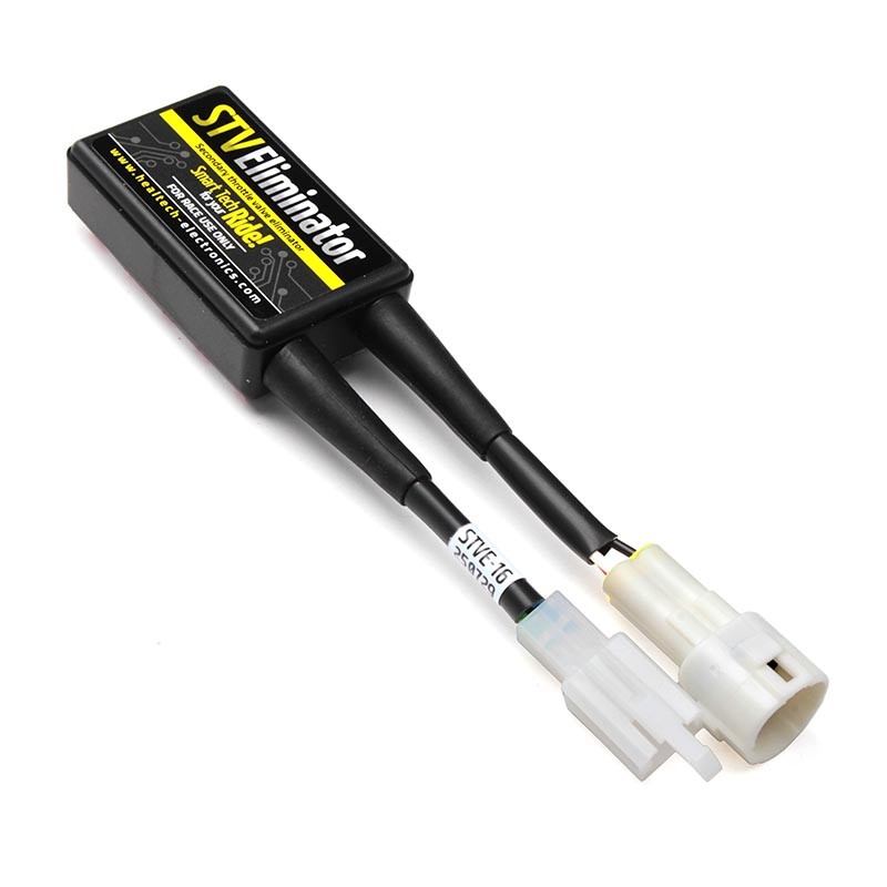 En raison des réglementations sur les émissions de gaz et le bruit, les papillons secondaires ont fait leur apparition sur les motos au cours de la dernière décennie. Ce papillon secondaire est contrôlé par l'ECU de la moto. Pour des performances maximales et une réponse précise à l'accélération, ce système secondaire est supprimé, principalement dans les courses sur circuit et en dragster. Cependant, dès que vous déconnectez le moteur de l'actionneur du papillon secondaire du faisceau de la moto, le témoin FI s'allume au tableau de bord. L'éliminateur STV se branche directement en plug&play sur le faisceau de la moto. À l'aide de ce petit boîtier, vous pouvez retirer l'ensemble de la vanne secondaire avec le moteur de l'actionneur, les plaques de vanne papillon et également la tige/arbre.