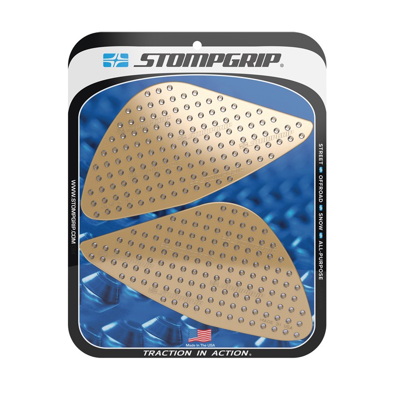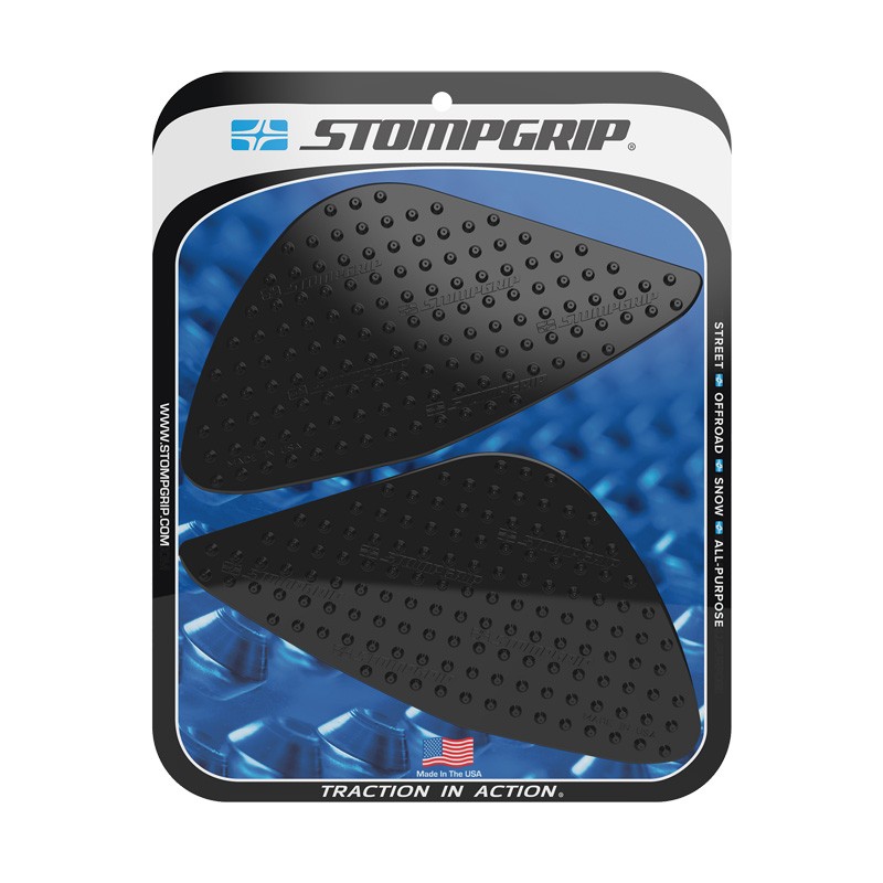 En 2002, STOMP Design élargit sa gamme jusqu'aux sports mécaniques, en lançant les grips de réservoir STOMPGRIP, spécialement conçus pour les moto-cross. Ces grips abrasifs ont pour vocation de garder le pilote en selle, en collant à son pantalon ou à ses bottes. Ils sont depuis lors applicables aux machines de route, de cross ou de quad. Ce sont finalement des accessoires indispensable, et des alliés contre la fatigue et le ballotage, quelle que soit votre machine de prédilection. Les grips sont spécialement conçus en fonction de la physionomie de chaque machine, ils sont également coupés à l'arrondis, afin d'éviter les décollements précoces. La surface en caoutchouc est soit transparente, soit noire, pour respecter l'esthétique de votre machine. Ces produits sont conçus pour s'user à la manière des pneus, et sont à remplacer périodiquement.