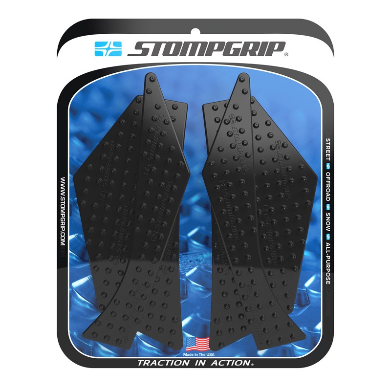 En 2002, STOMP Design élargit sa gamme jusqu'aux sports mécaniques, en lançant les grips de réservoir STOMPGRIP, spécialement conçus pour les moto-cross. Ces grips abrasifs ont pour vocation de garder le pilote en selle, en collant à son pantalon ou à ses bottes. Ils sont depuis lors applicables aux machines de route, de cross ou de quad. Ce sont finalement des accessoires indispensable, et des alliés contre la fatigue et le ballotage, quelle que soit votre machine de prédilection. Les grips sont spécialement conçus en fonction de la physionomie de chaque machine, ils sont également coupés à l'arrondis, afin d'éviter les décollements précoces. La surface en caoutchouc est soit transparente, soit noire, pour respecter l'esthétique de votre machine. Ces produits sont conçus pour s'user à la manière des pneus, et sont à remplacer périodiquement.